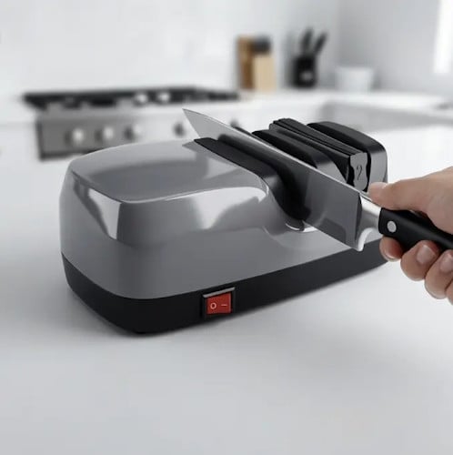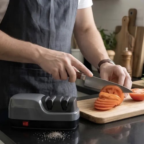 - Deze messenslijper wordt gepresenteerd als een eenvoudige oplossing voor snel bijslijpen tussen normale kookhandelingen door.